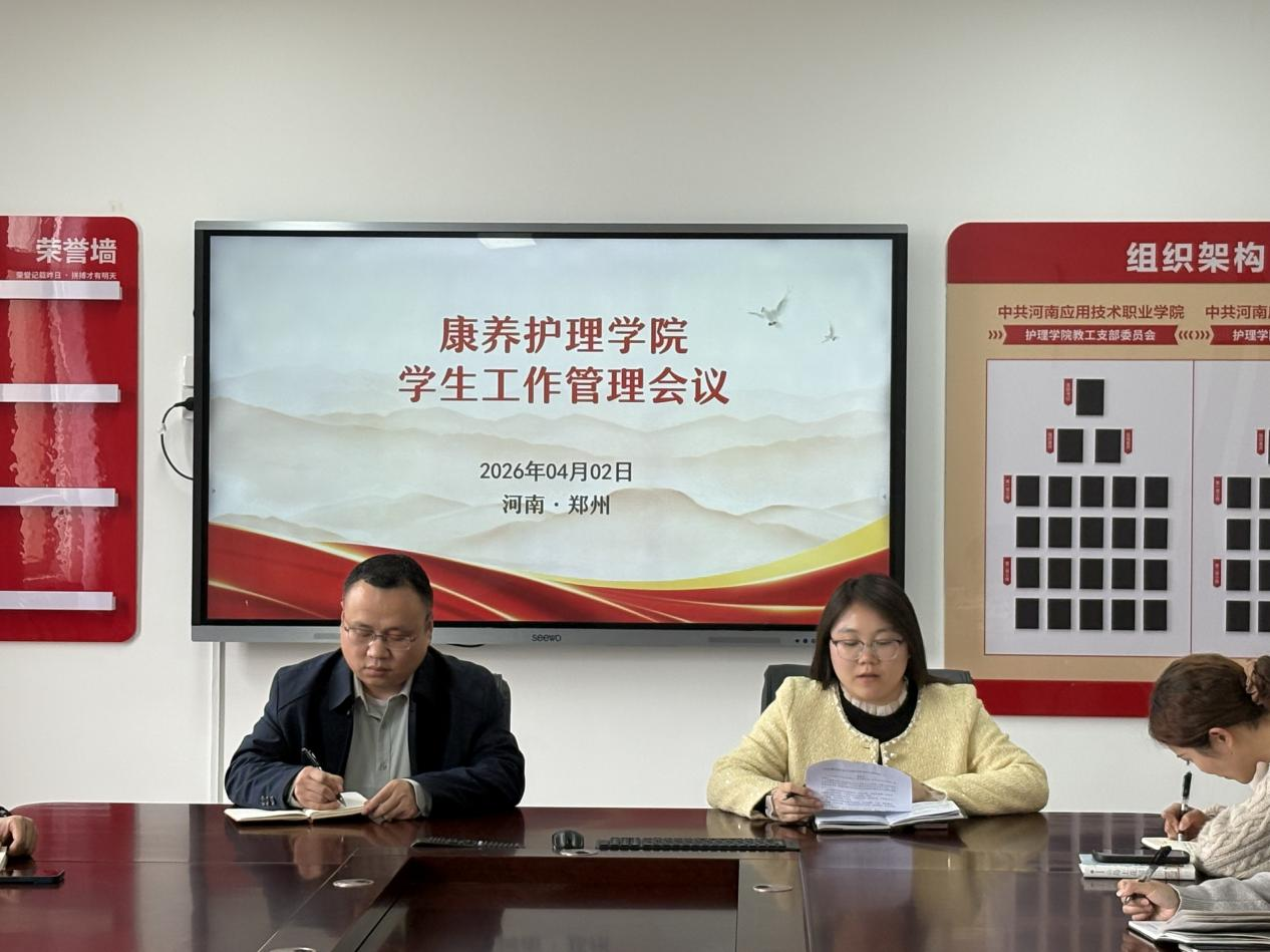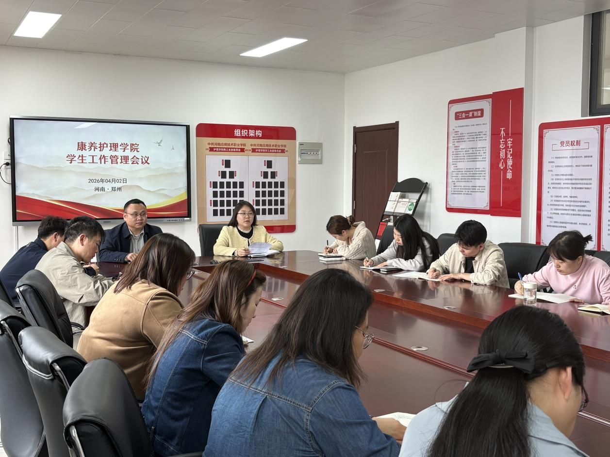 2026年4月2日,康养护理学院召开学生管理工作会议,全面总结开学以来学生管理工作成效,统筹部署学生日常管理、寝室安全、清明节假期安全保障及春季运动会筹备等重点任务。学院党总支书记张忠勇、副书记景淼及全体辅导员参会。