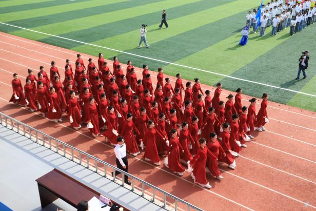 随后,学院方阵登台展演,以灵动舞姿呈现视听盛宴。表演者们身着朱红长裙,手拿长绸扇,以柔美婉转的舞姿,将古典舞的雅致与青春的蓬勃完美融合。同学们以灵动的身姿传递文化自信,用优雅的舞步诠释责任担当,将中华优秀传统文化的魅力与康养护理专业的人文温度融入每一个动作之中,赢得了观礼师生的阵阵掌声与喝彩。