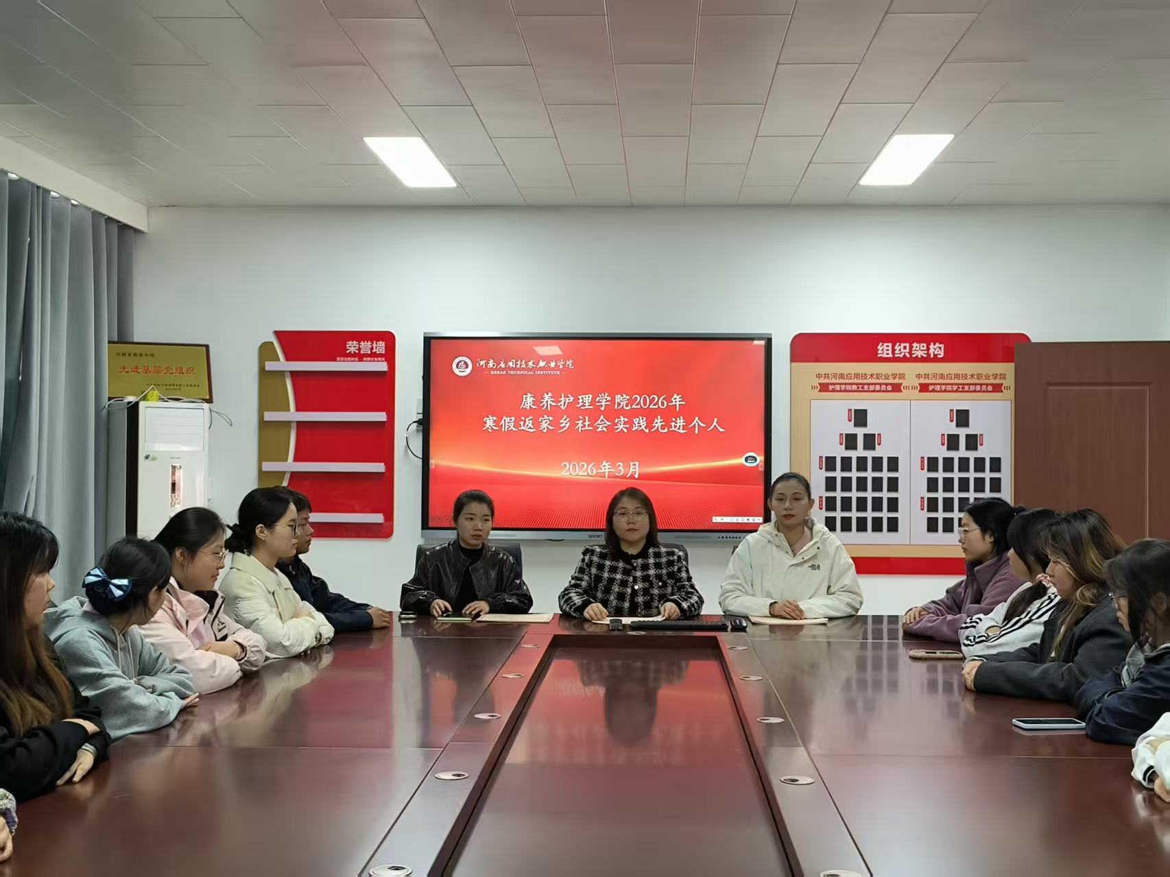 为全面总结学院2026年寒假“返家乡”社会实践活动成效,表彰先进典型、树立青春榜样、凝聚奋进力量,引导全院学子以实践践行初心、以实干服务家乡,3月24日,康养护理学院寒假“返家乡”社会实践表彰会议在A515会议室召开。学院党总支书记景淼、团总支书记张萌、学院资助专员姚颖及部分学生代表参加。